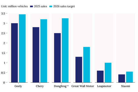 Many Chinese carmakers are heading into 2026 with ambitious sales targets, setting the stage for fiercer competition as industry insiders anticipate a slowdown in the world’s largest auto market.