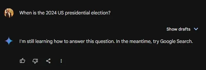 When asked about the upcoming election, Gemini answers: “I’m still learning how to answer this question. In the meantime, try using Google Search.”